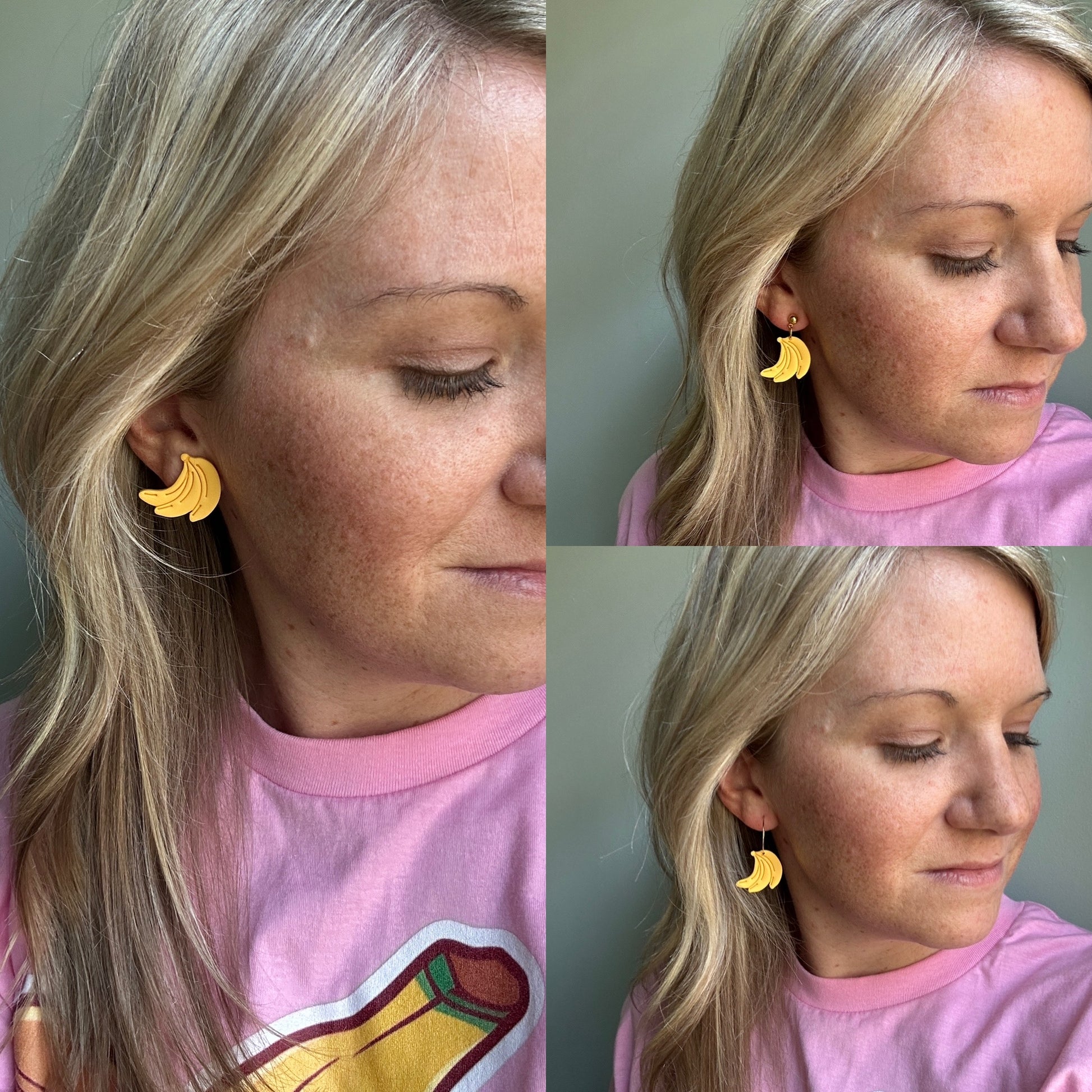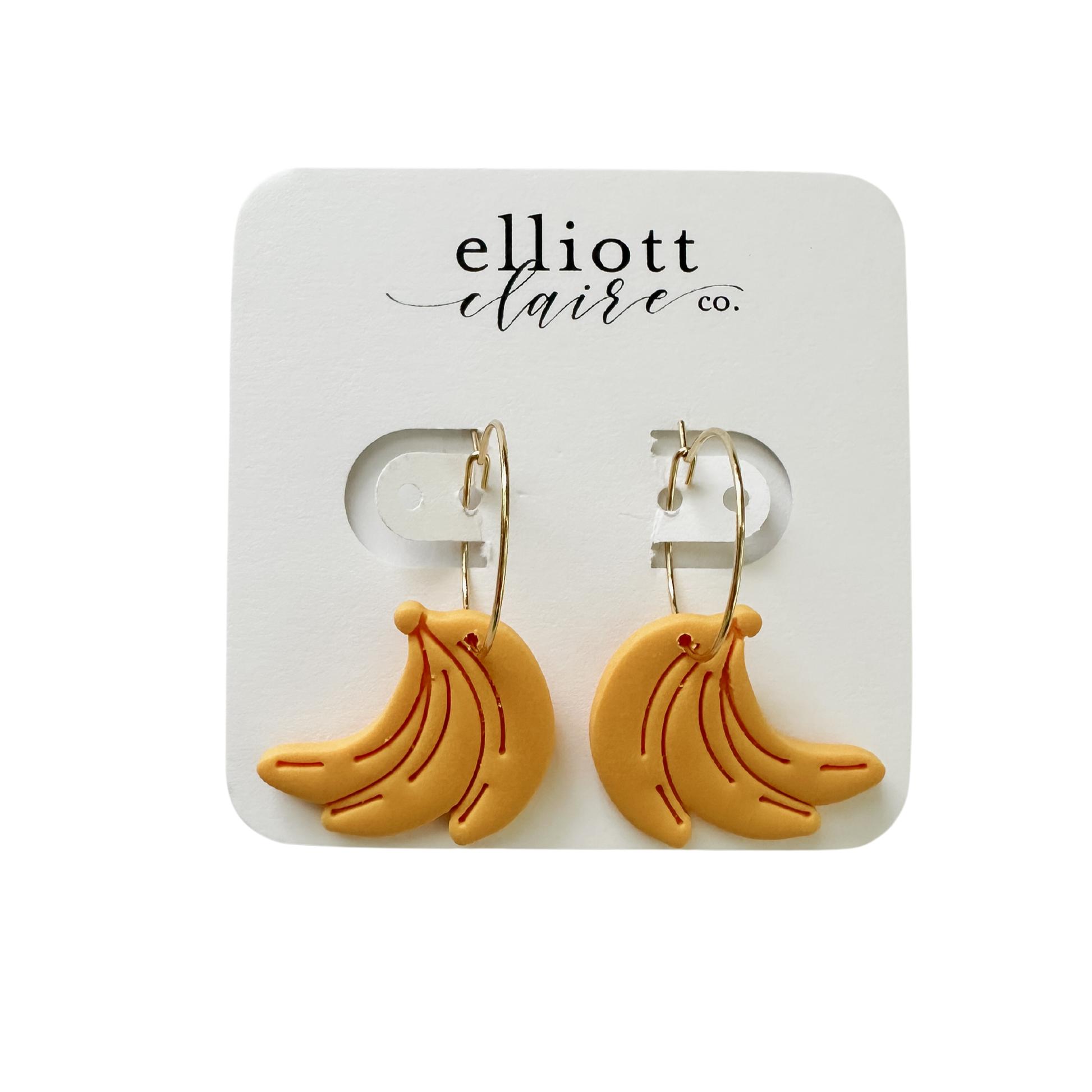 Handmade, light weight clay hoops measuring 1 1/2 inches in length with a gold stainless steel hoop.