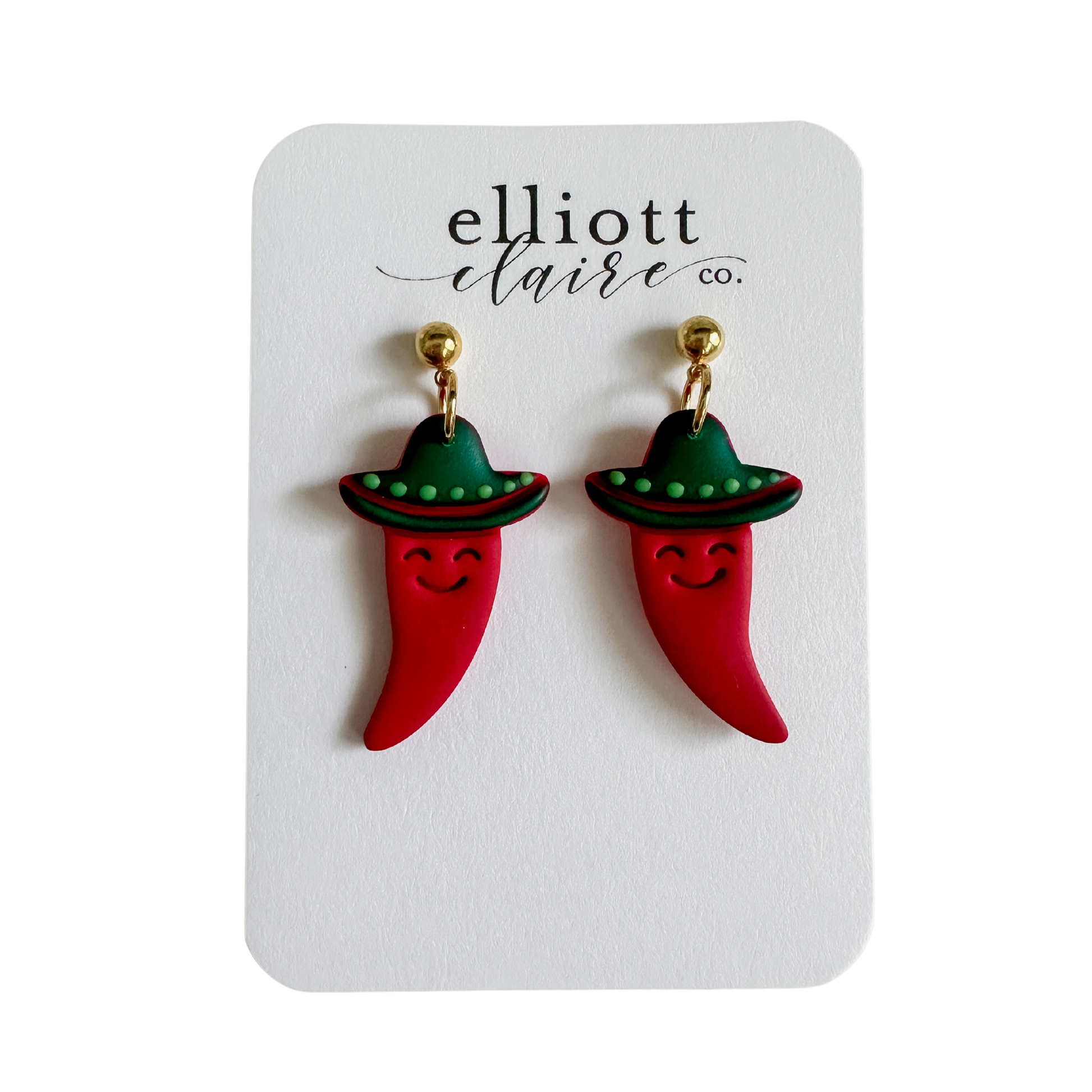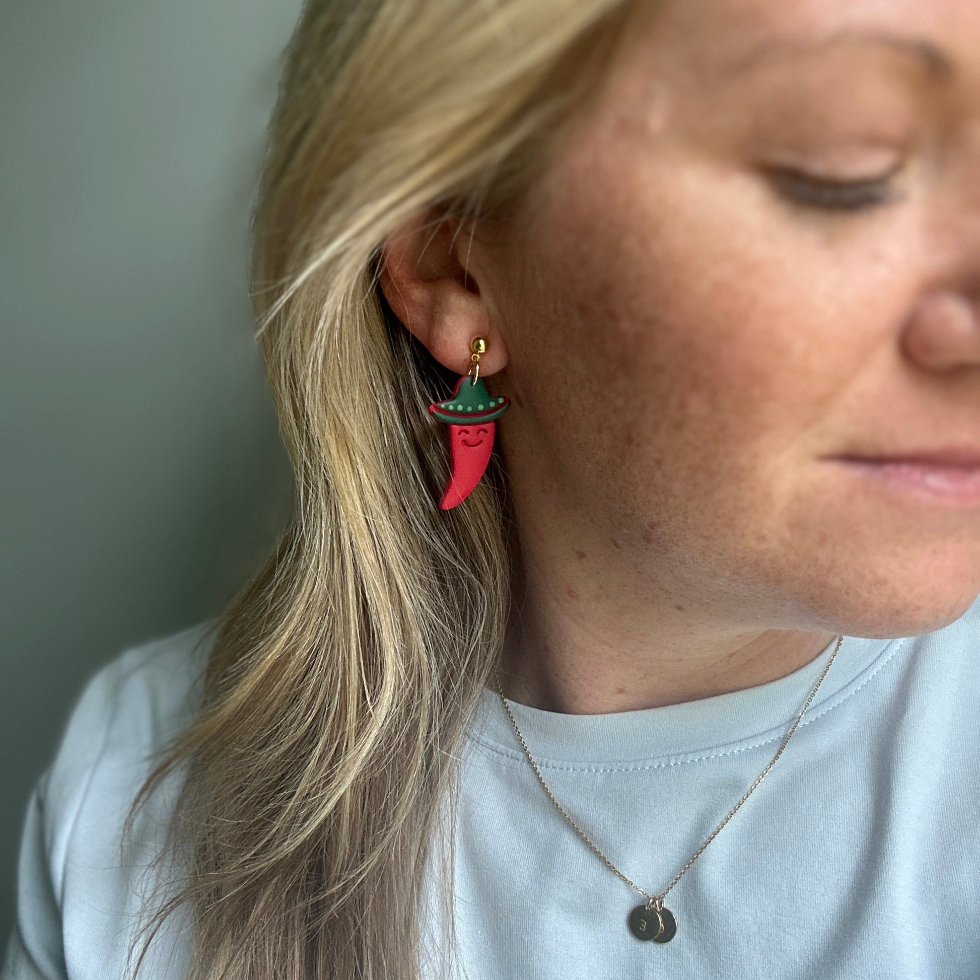 Handmade, lightweight clay dangles measuring 1 1/2 inches in length with a gold ball point stud.