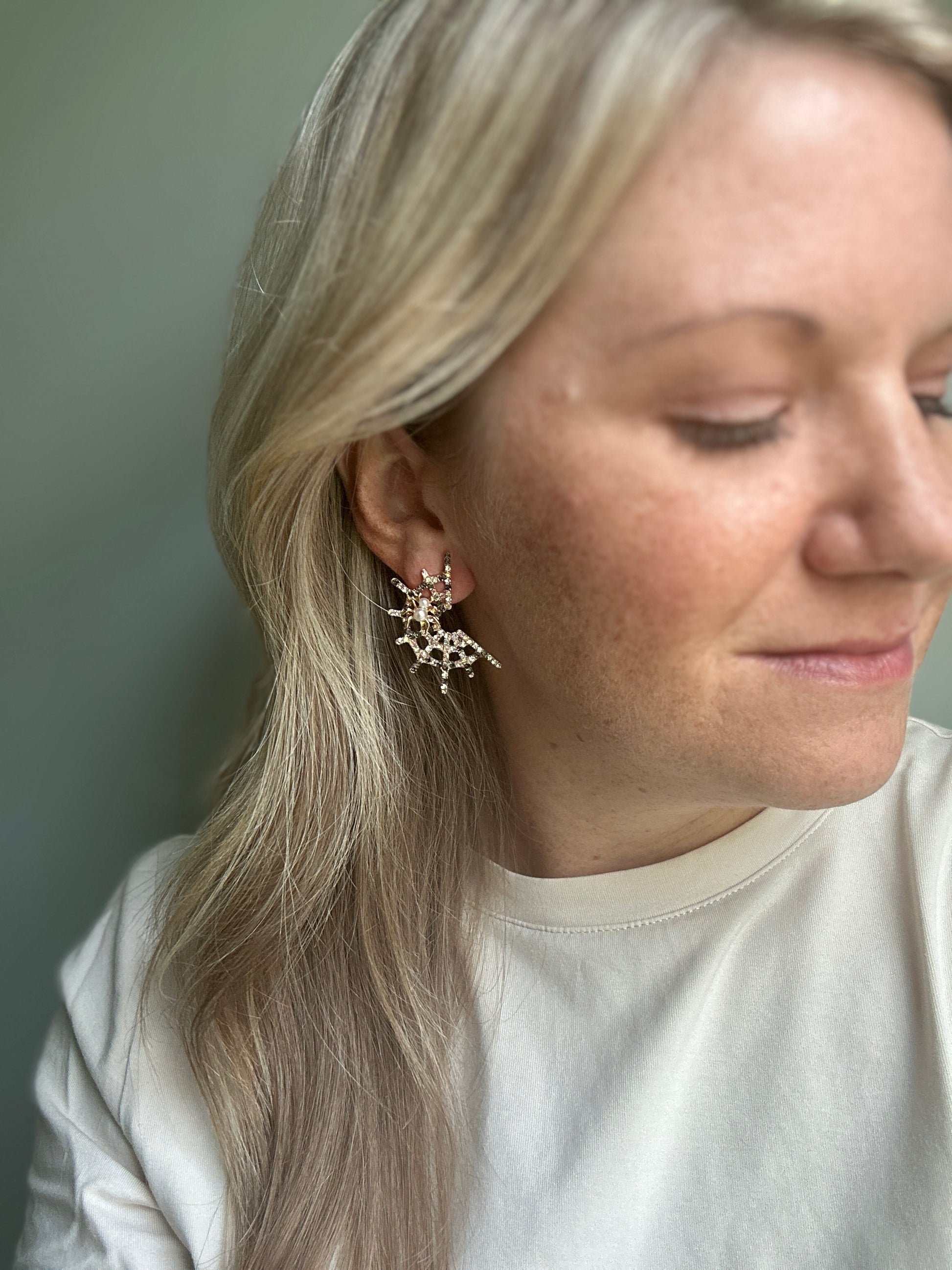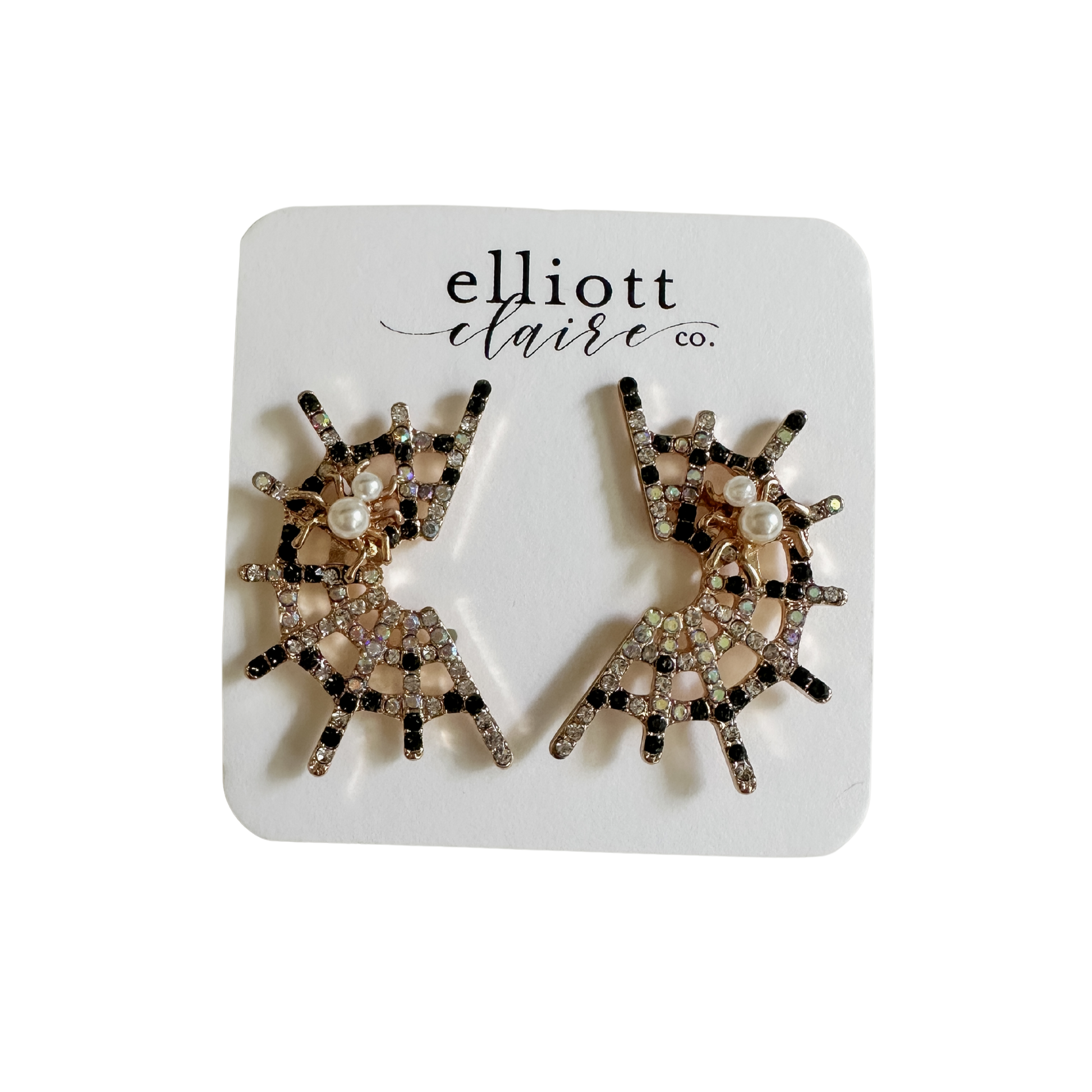 Metal spiderweb studs with crystal embellishments and a pearl spider measuring 1 1/2 inches in length.