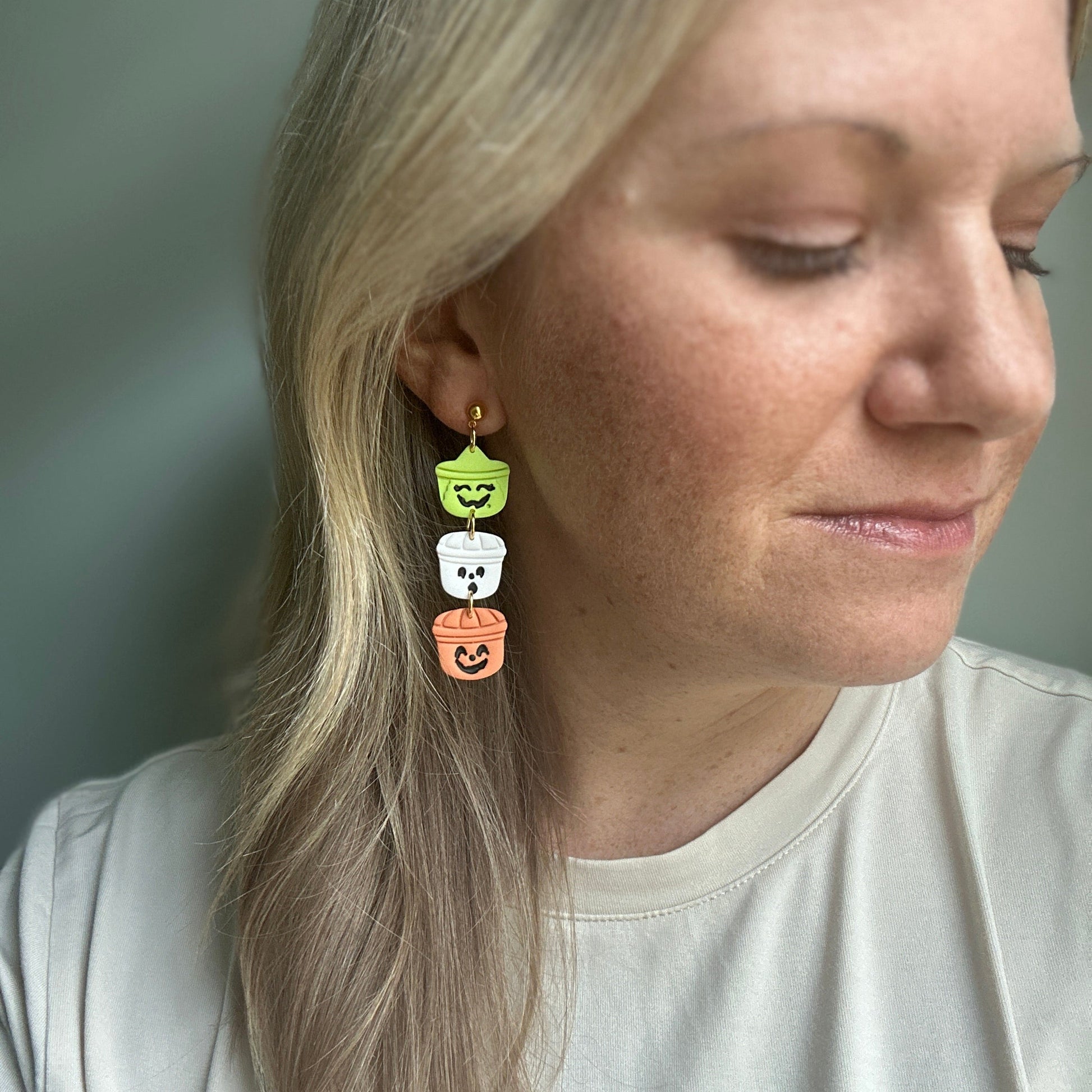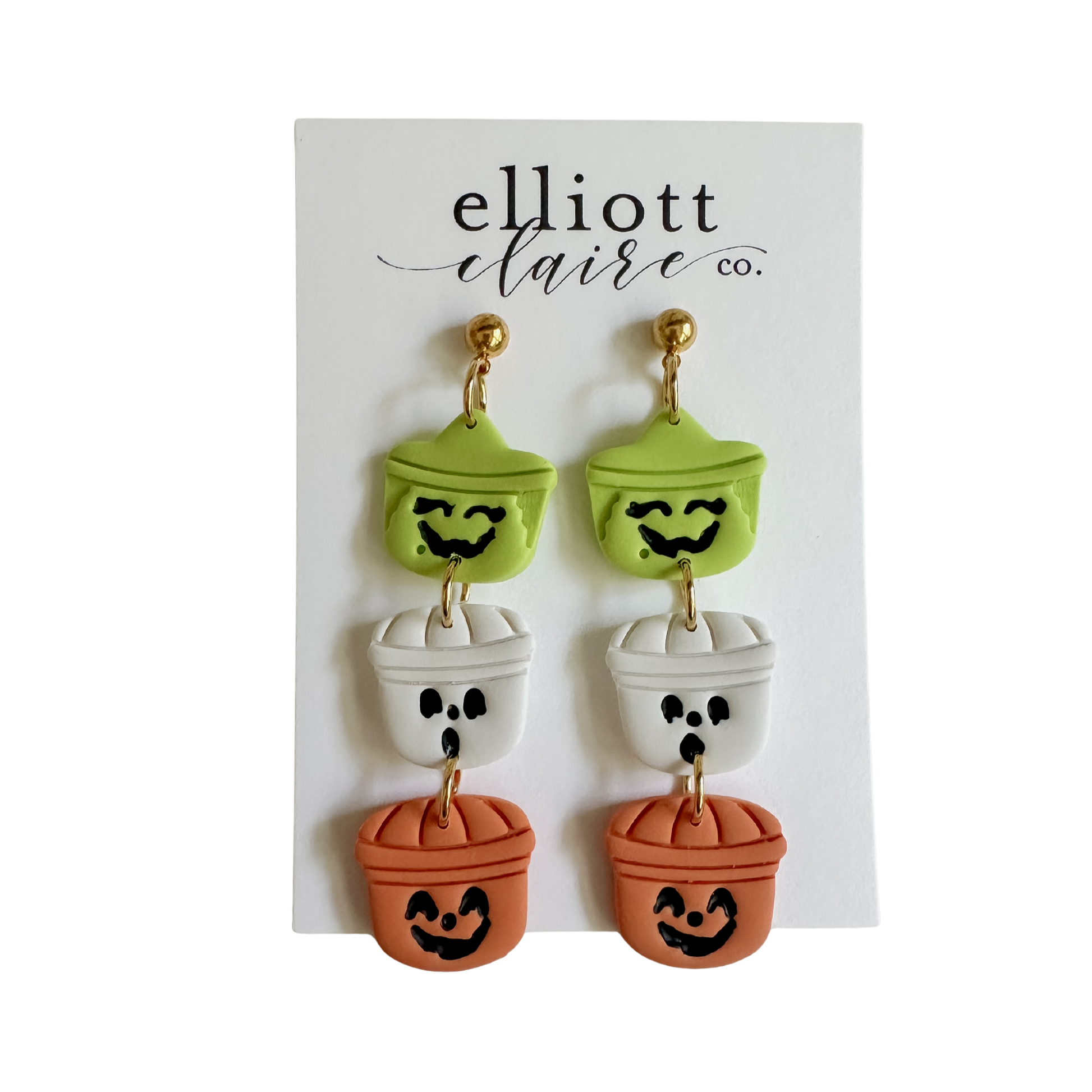 Handmade, lightweight clay dangles with a gold ball point stud measuring 2 3/4 inches in length.
