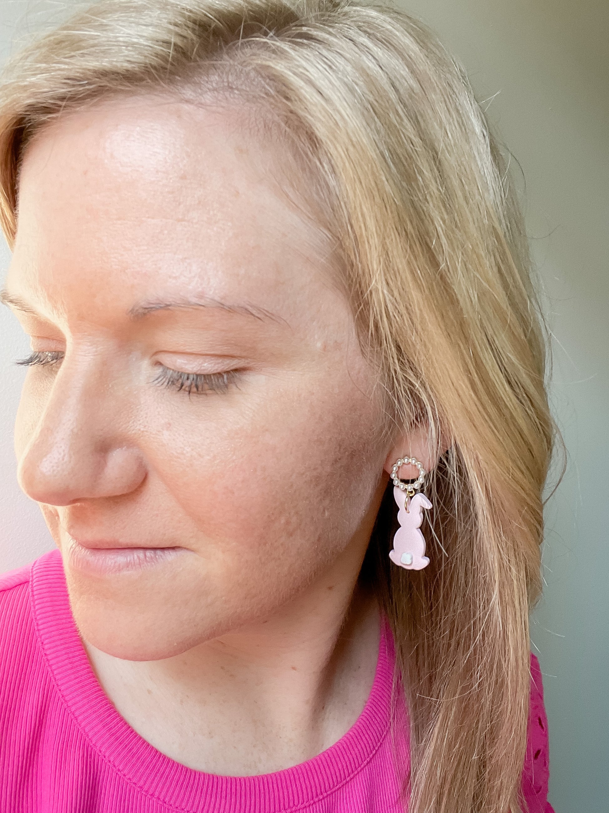 Handmade clay bunny dangles just shy of 1 3/4 inches in length with a beautiful hypoallergenic pearl stud. Lightweight and perfect for both adults and kids!