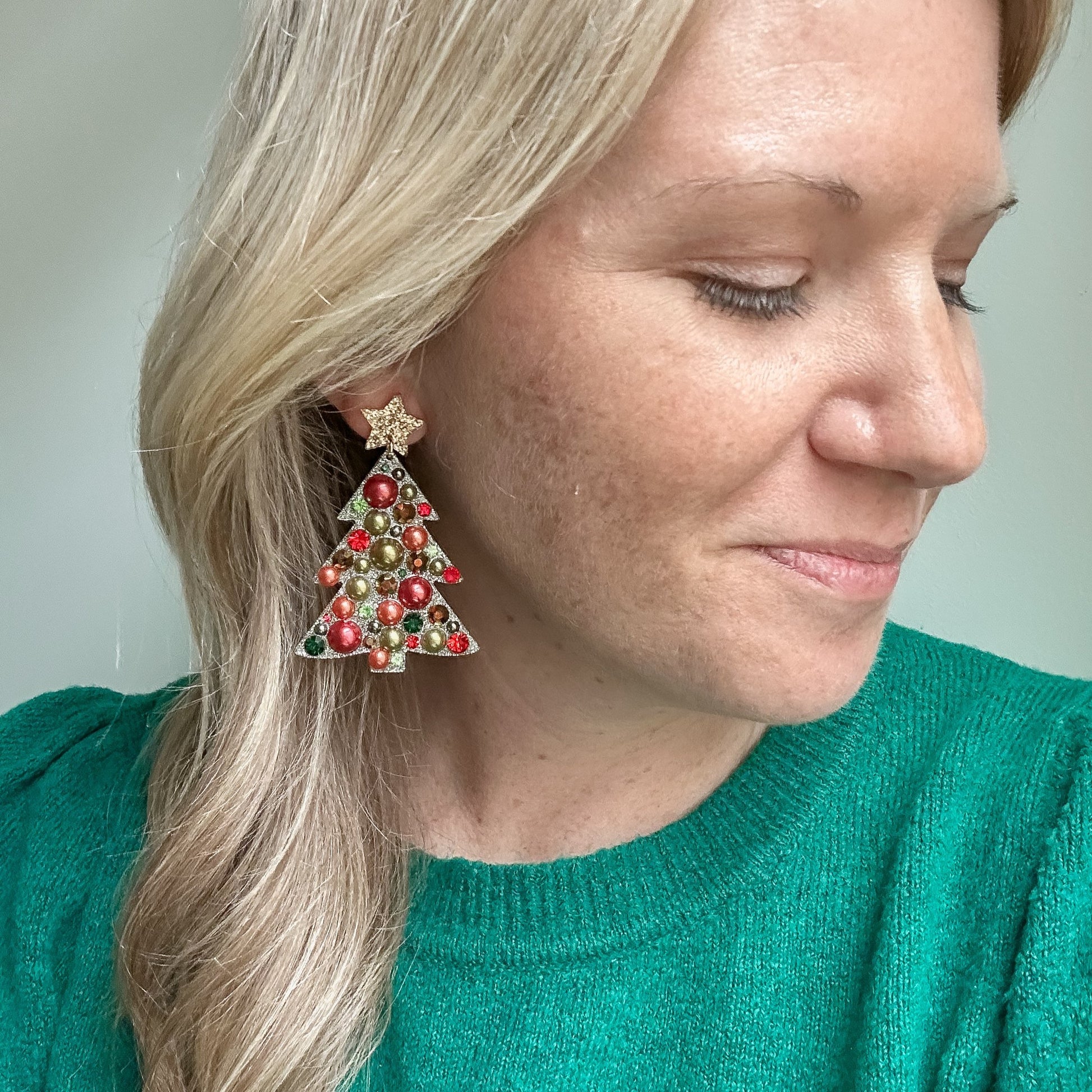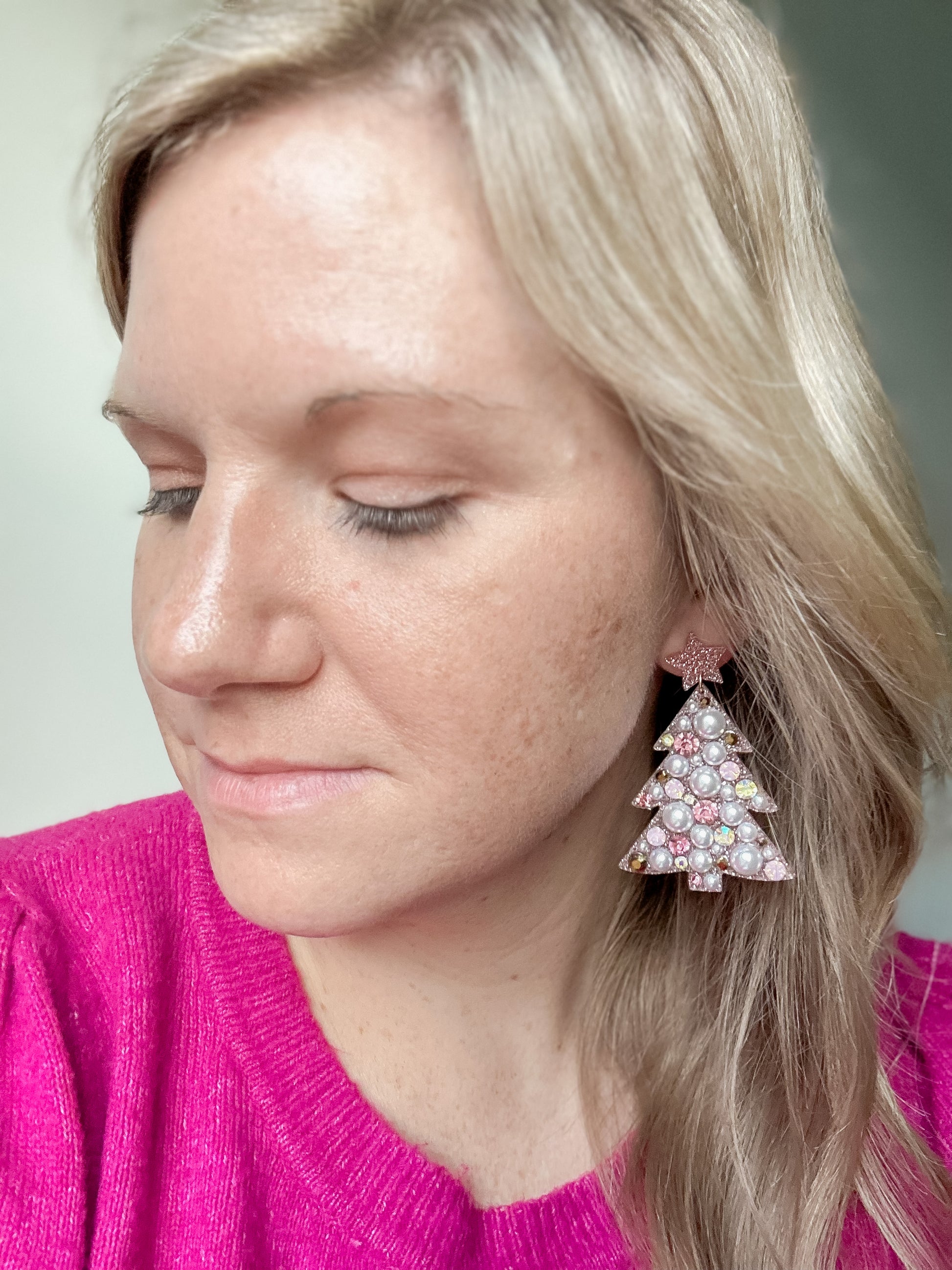 Rhinestone and pearl Christmas tree dangles measuring 2 3/4 inches in length.