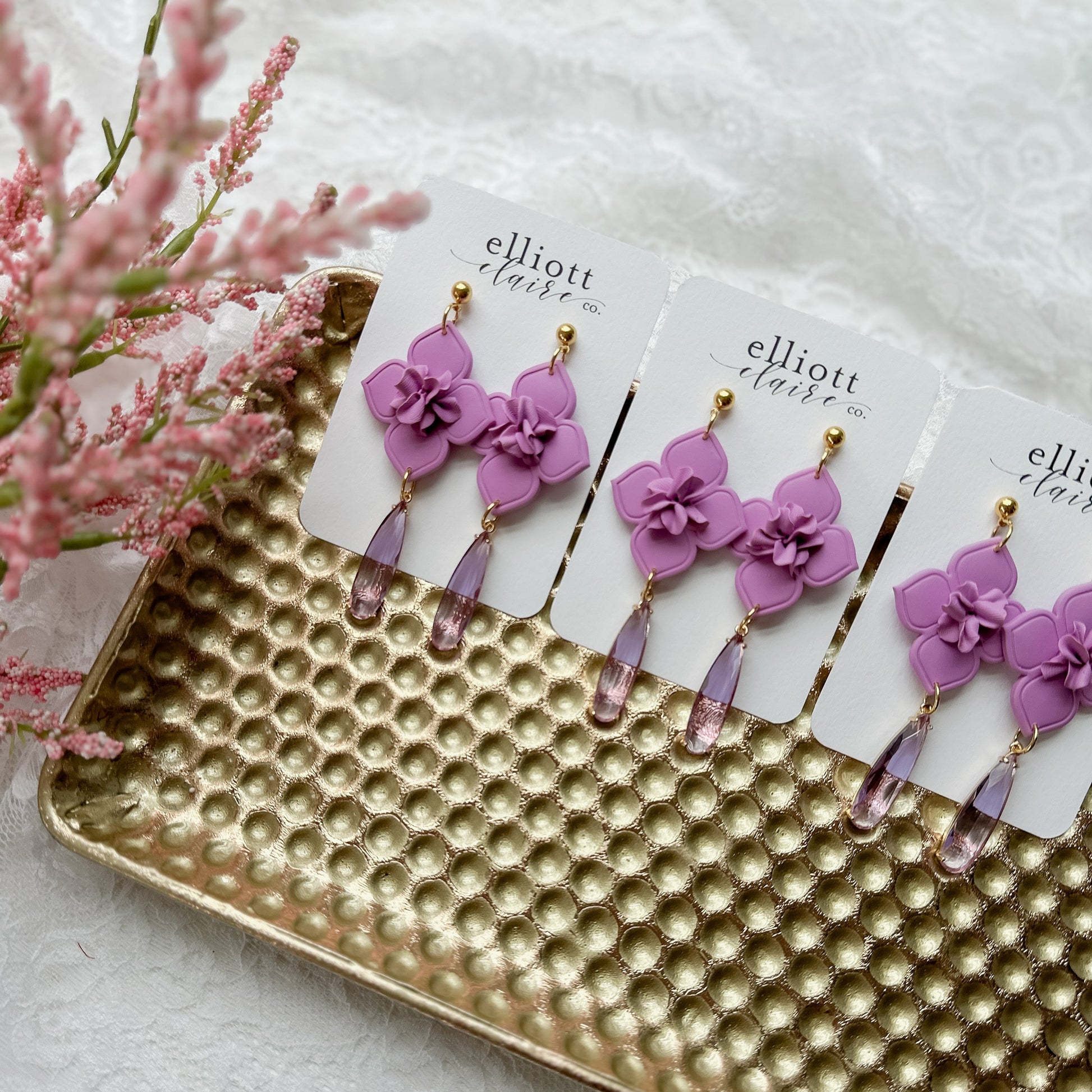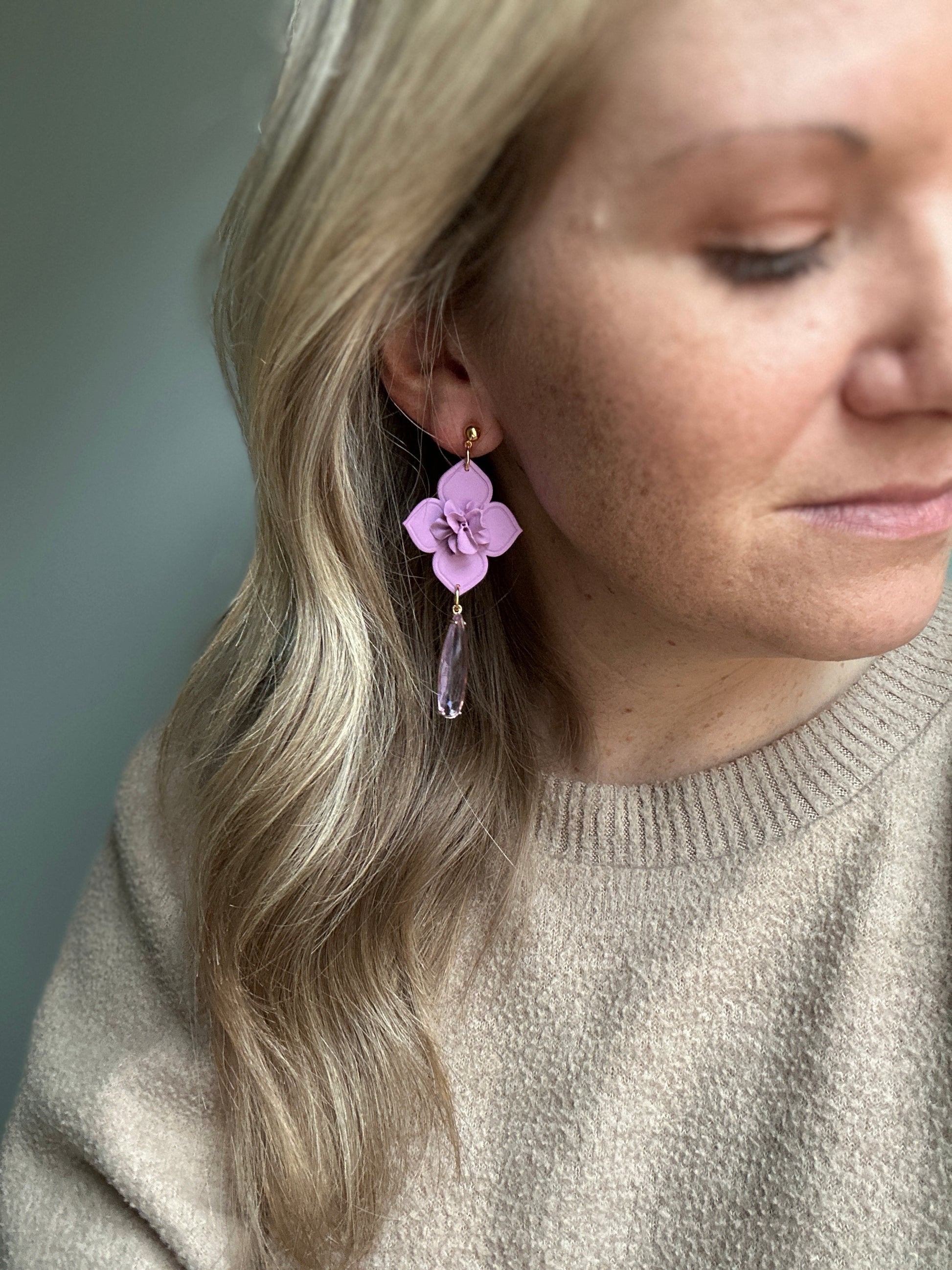 Handmade clay dangles with a purple glass pendant measuring 3 1/4 inches in length.