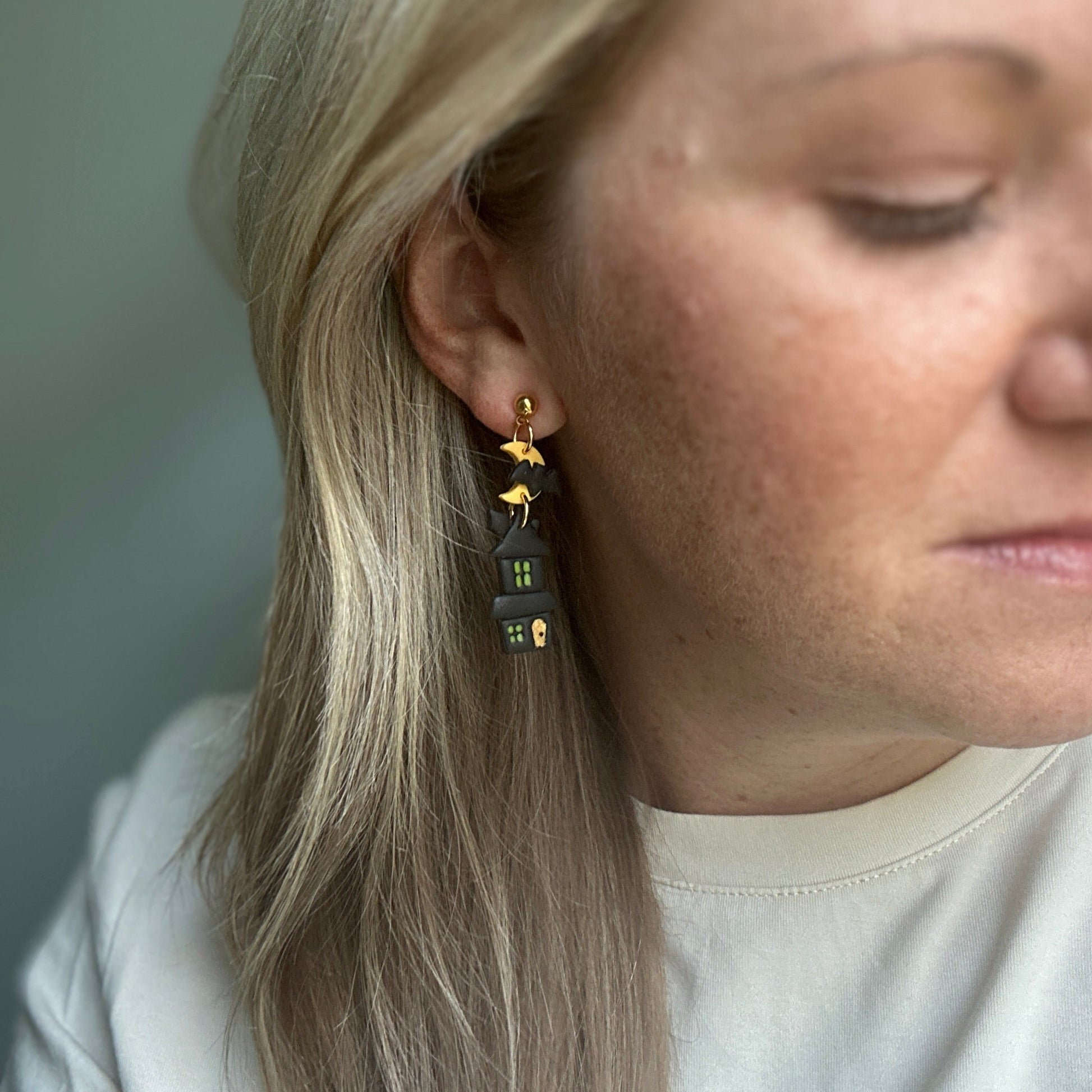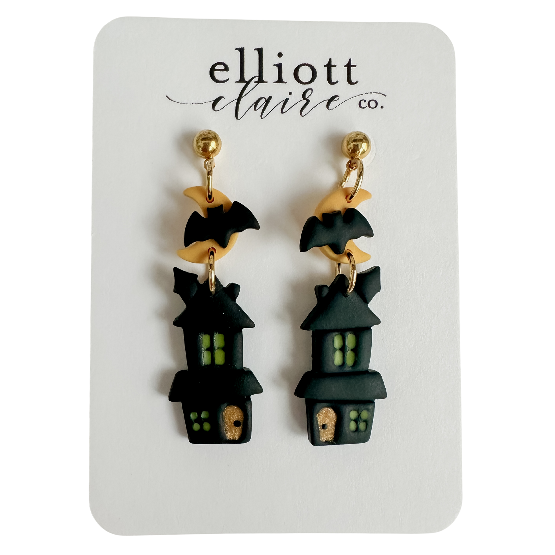 Handmade, lightweight clay dnagles with a gold ball point stud measuring 2 inches in length.