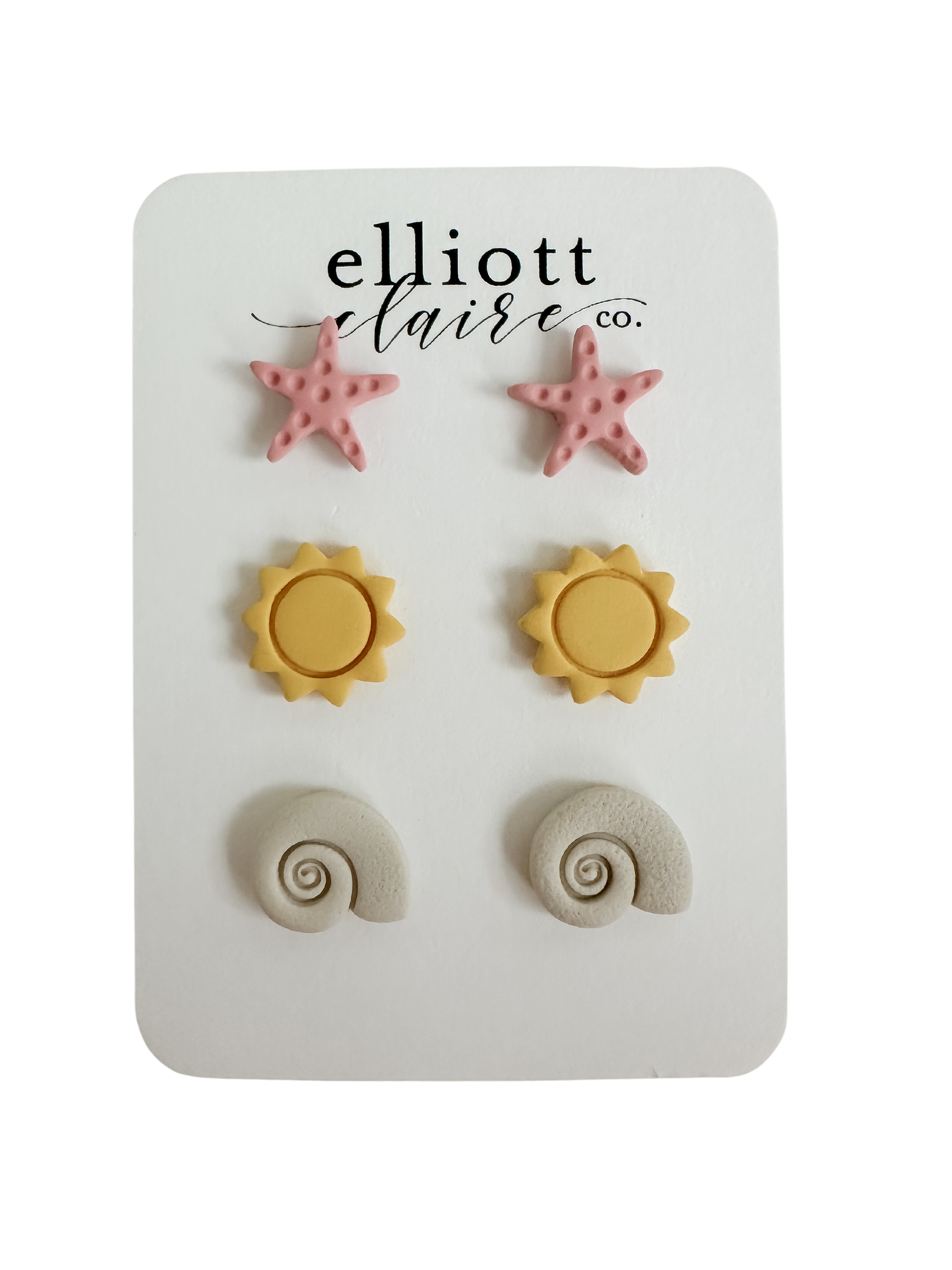 3 pairs of handmade, lightweight clay studs all with stainless steel earring posts, perfect for both adults and kiddos with sensitive ears!