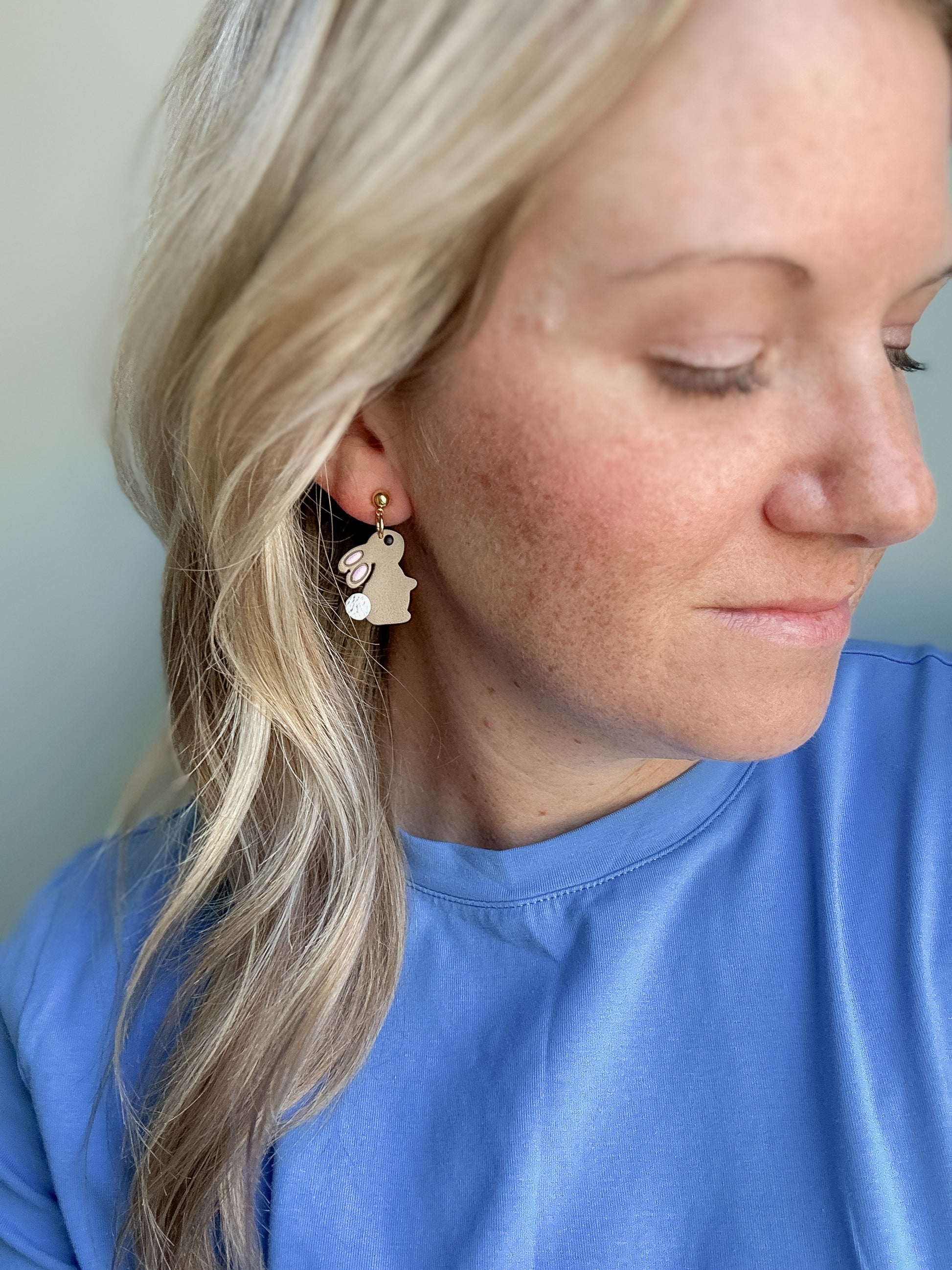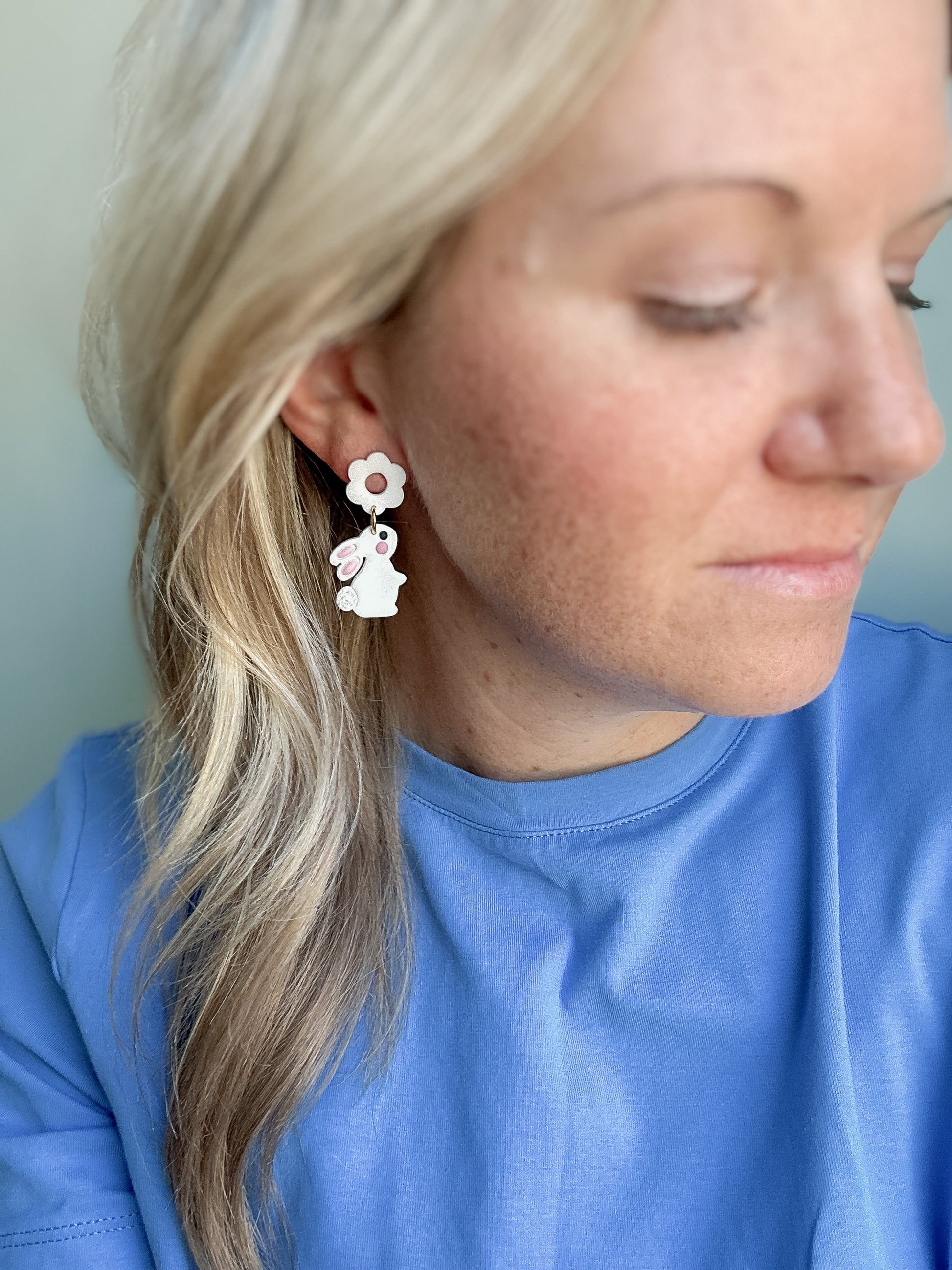 Daisy Bunny measuring 1 3/4 inches in length with surgical steel earring posts, perfect for those with sensitivities.