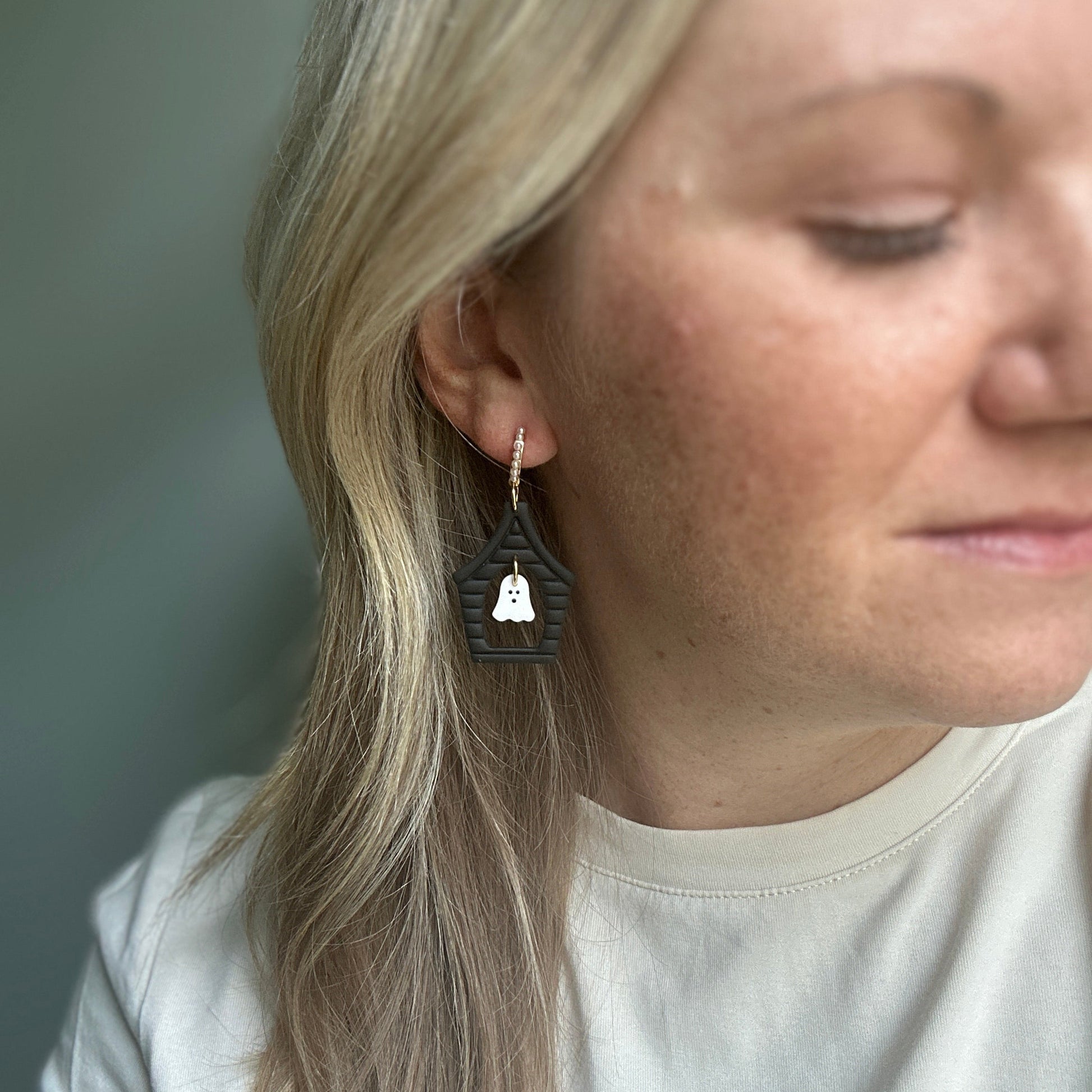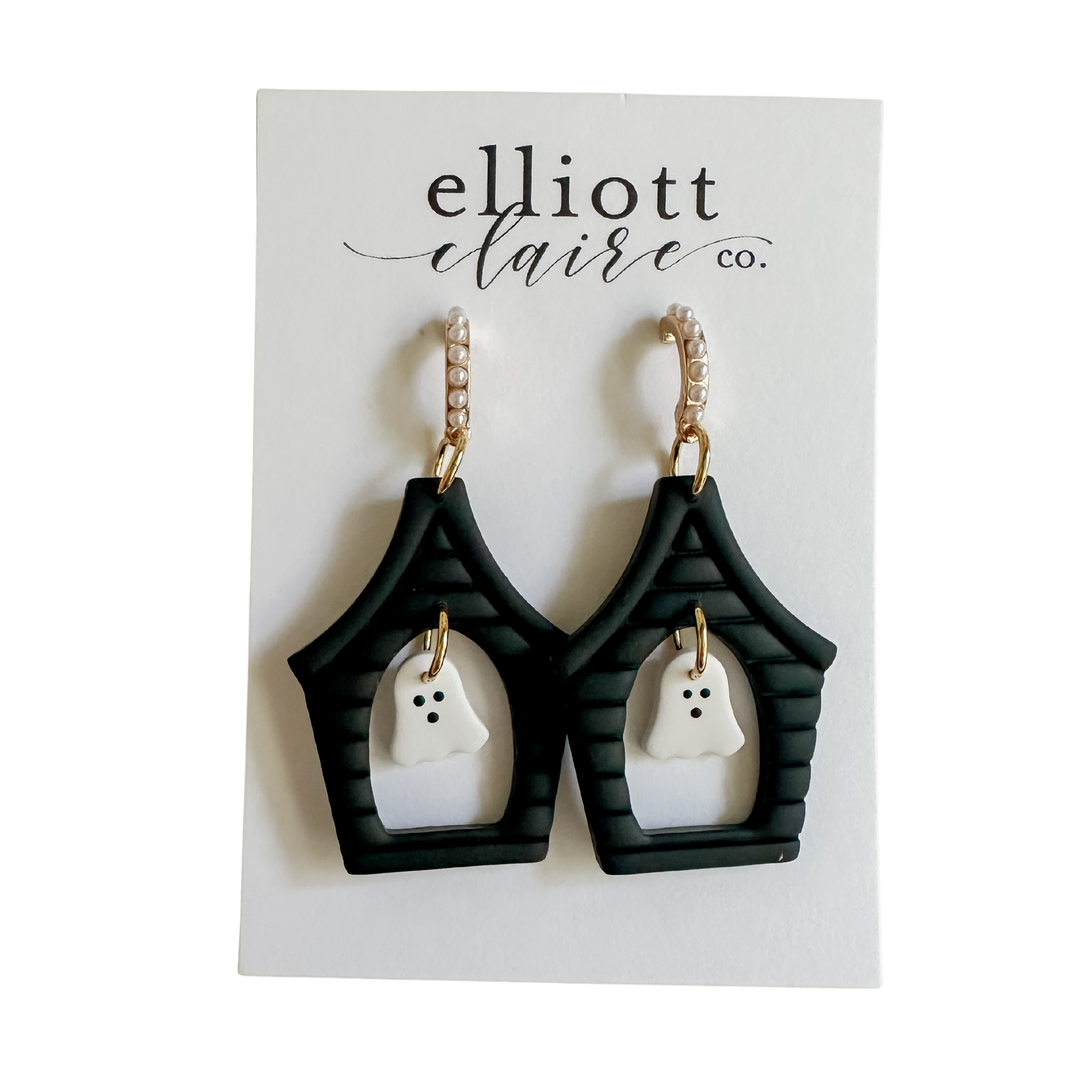 Handmade, lightweight clay dangles with an arched pearl stud measuring 2 1/4 inches in length.