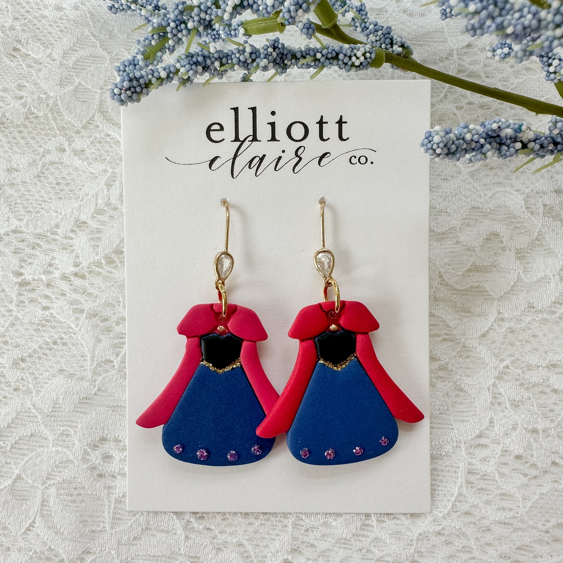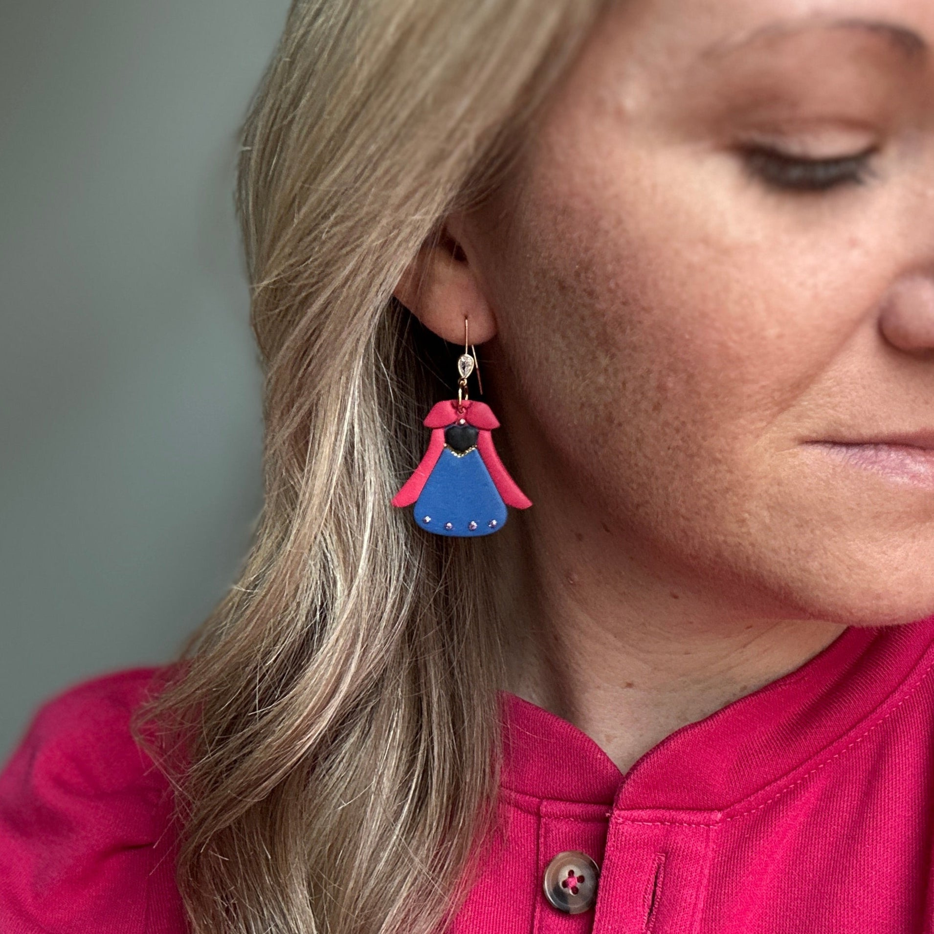 Handmade clay dangles measuring 2 1/4 inches in length with the gold cubic zirconia fishhook stud.