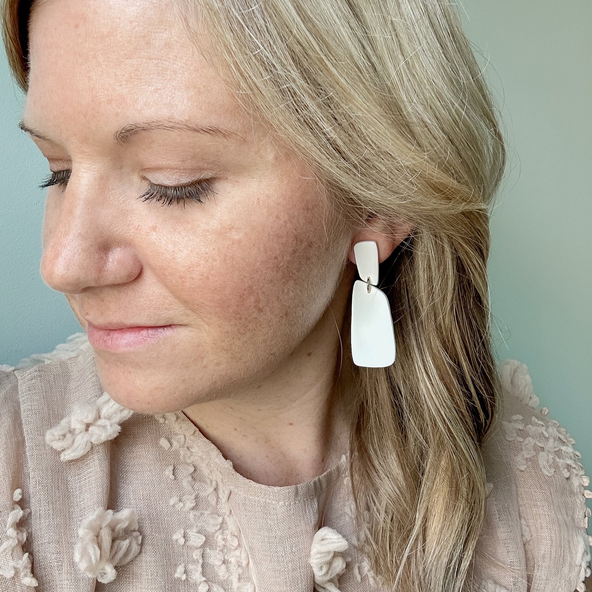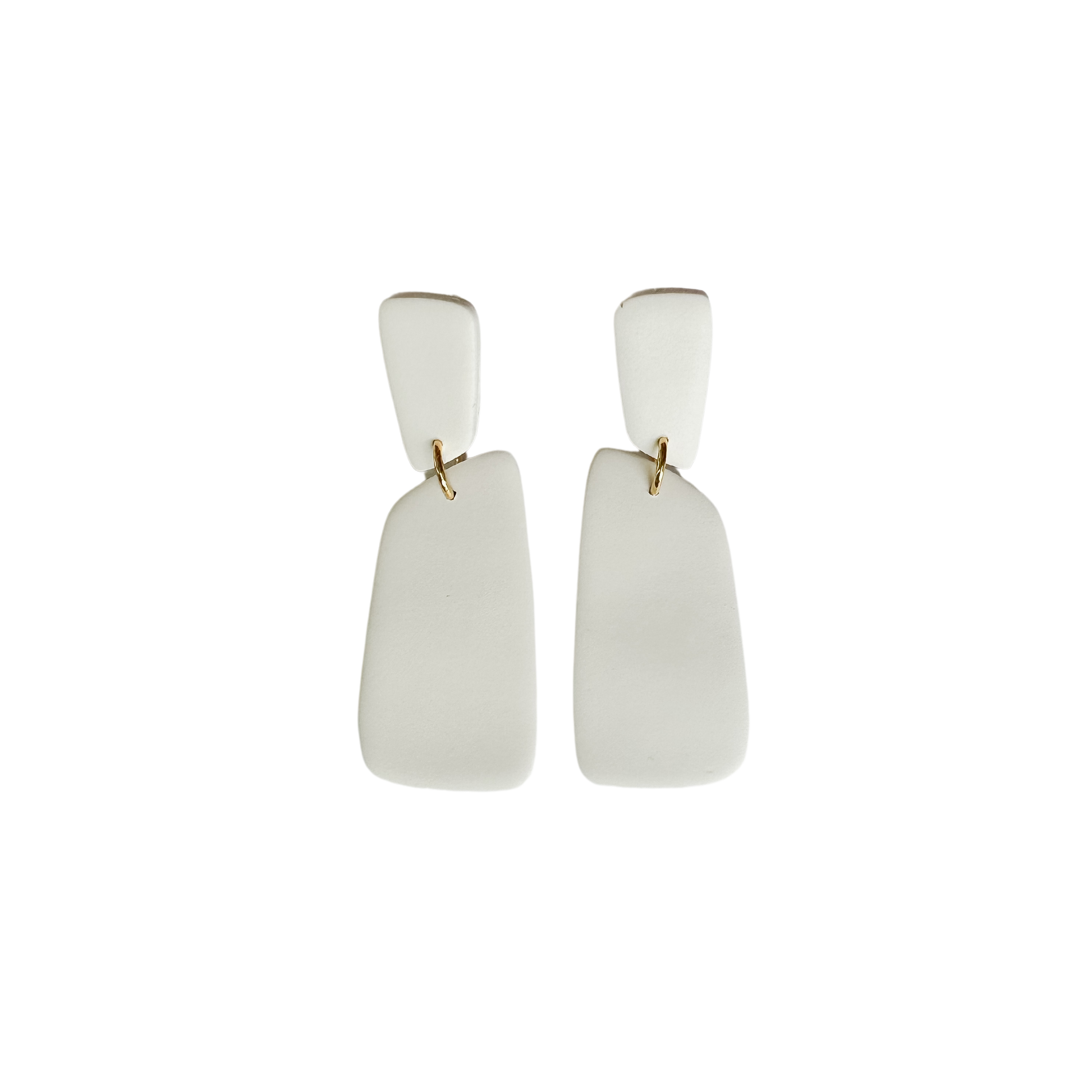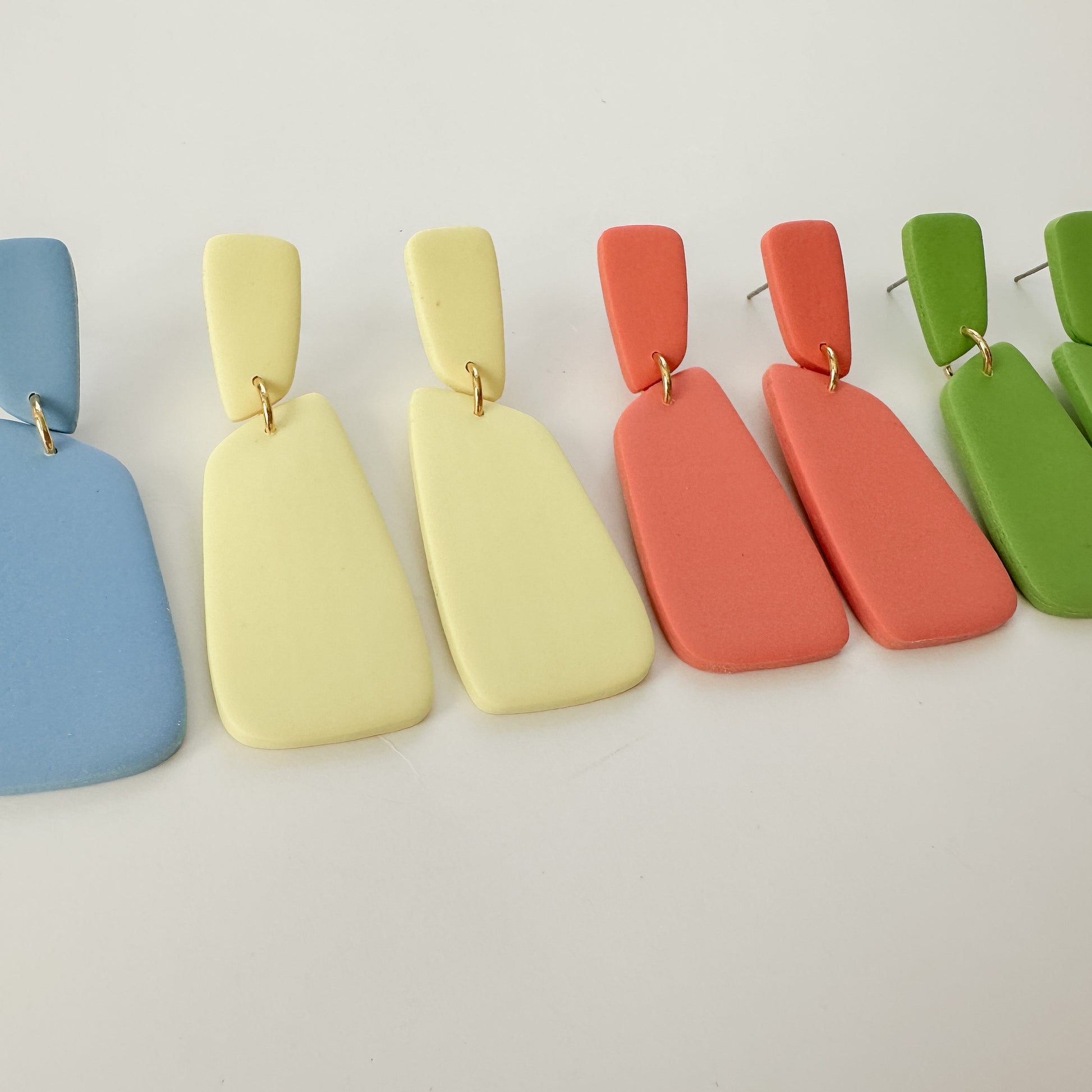 Handmade clay dangle measuring 2 1/4 inches in length with a stainless steel earring post.