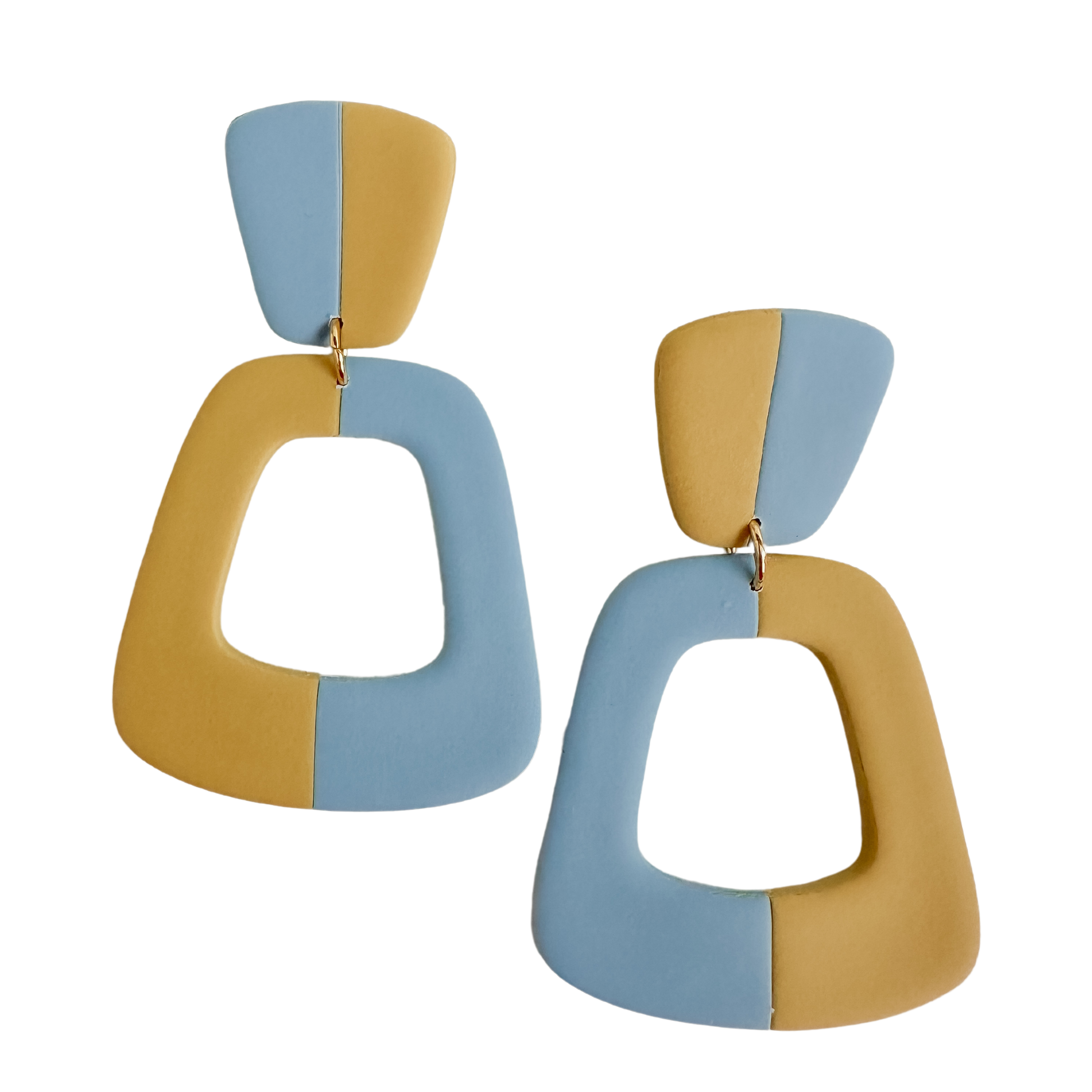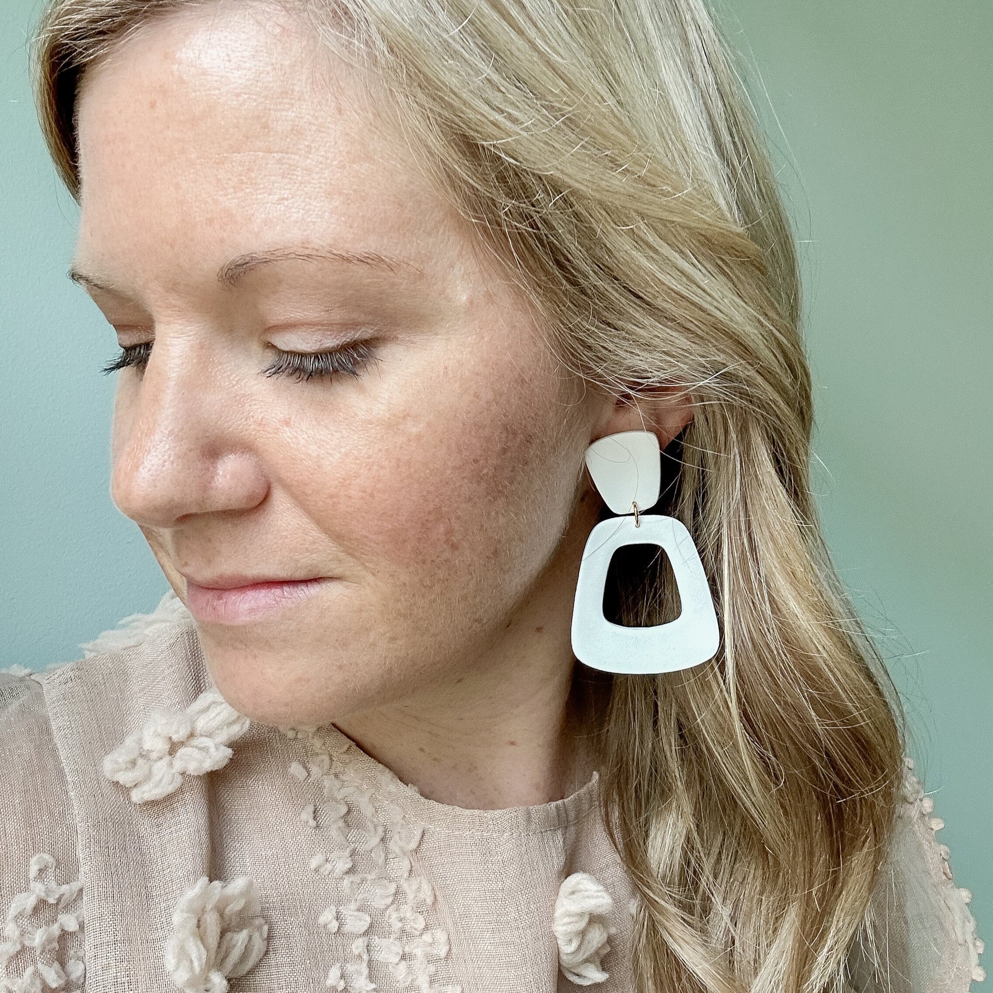 Handmade clay dangle measuring just over 2 1/2 inches in length with a stainless steel earring post.