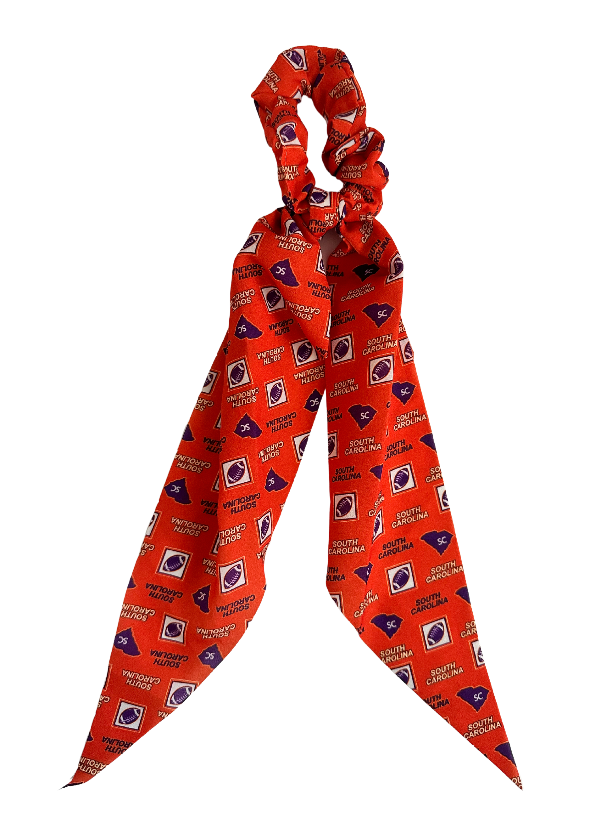 Silk scrunchie with bow like tails measuring 11 inches in length.