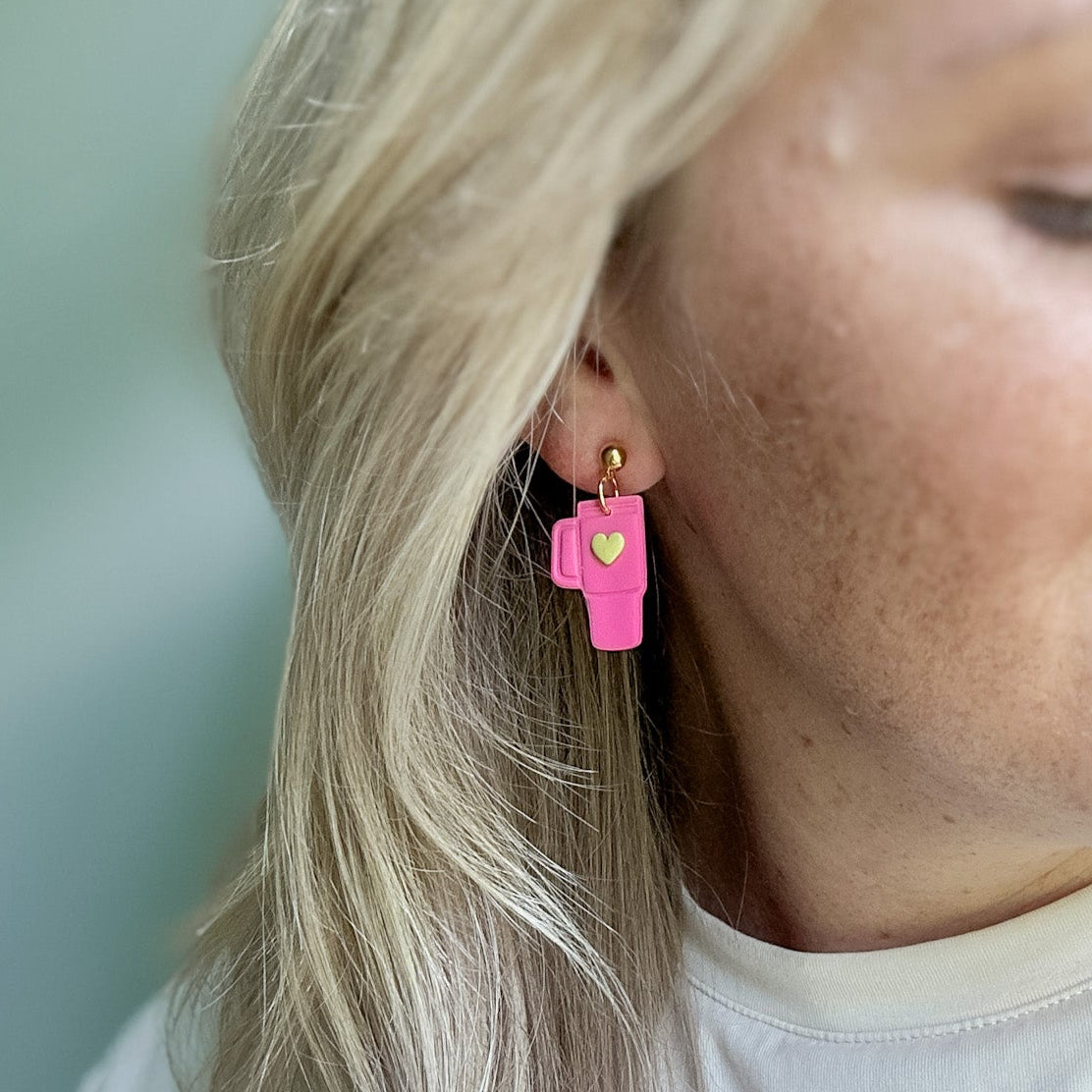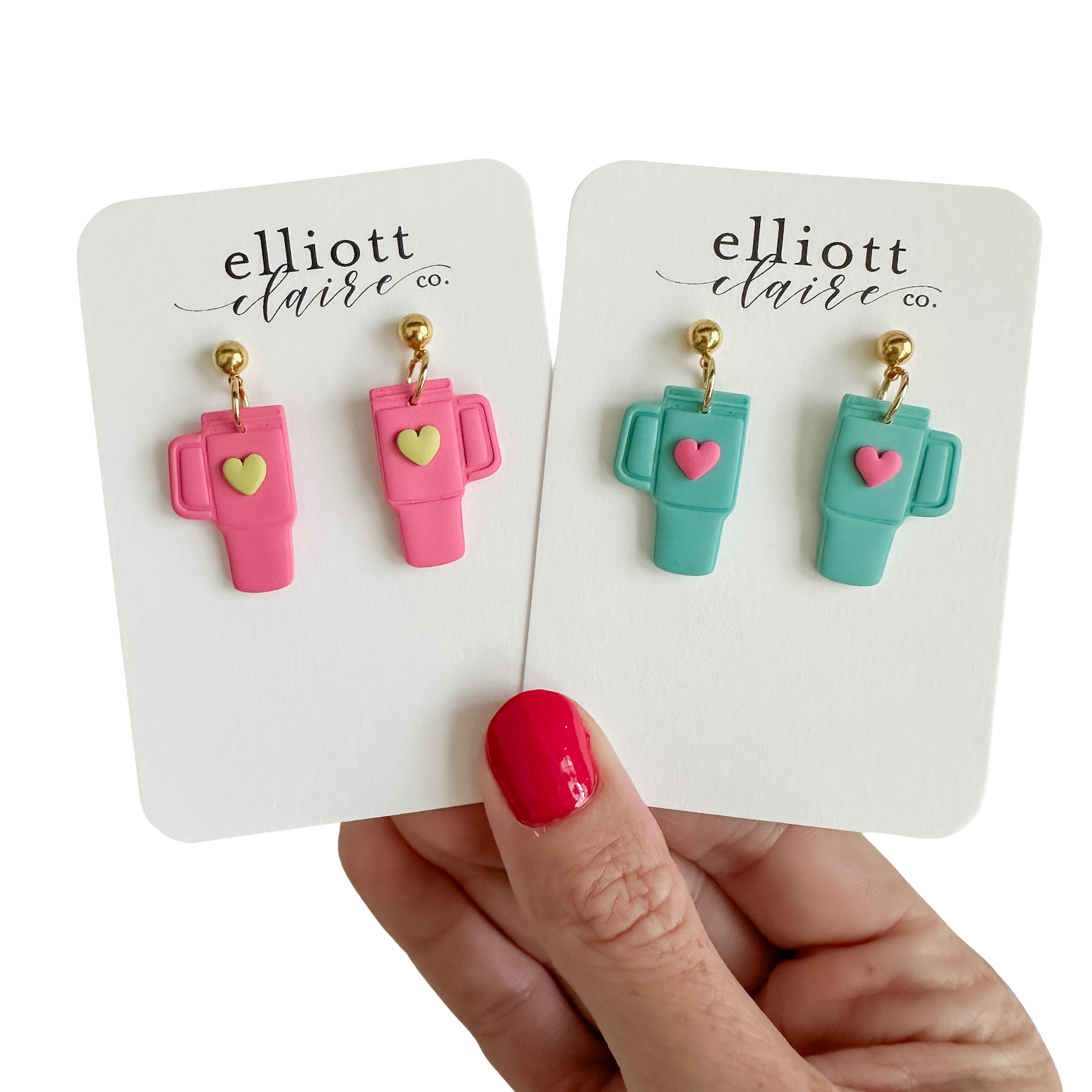 Lightweight, handmade clay dangles measuring 1 3/8 inches in length with gold ball point posts.